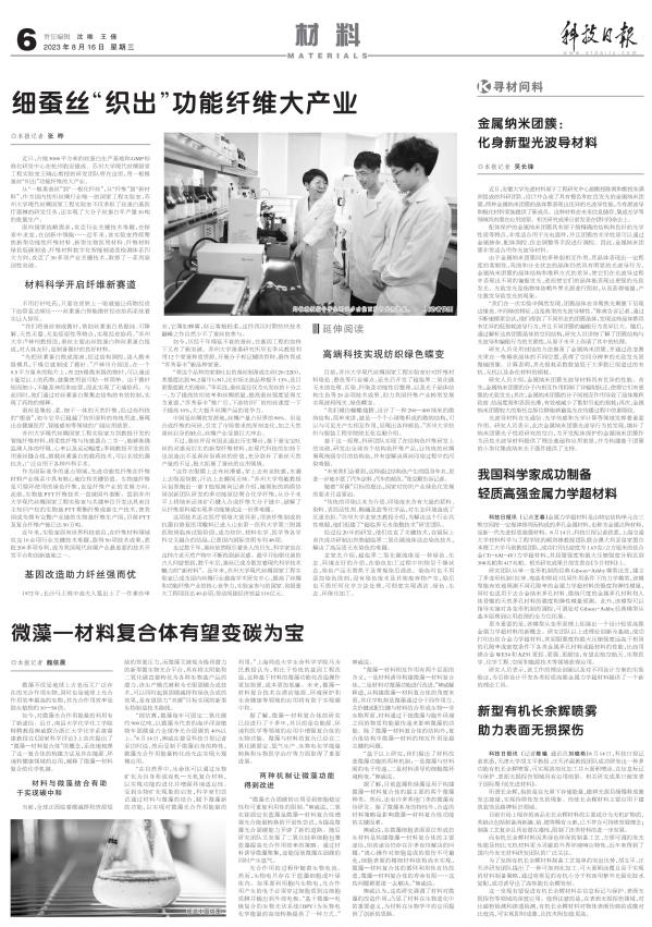 走过数千年,蚕丝依然吸引着世人的目光,科学家也在这种古老天然产物中不断找到新灵感。最早开始驯化蚕的古人何曾想到,数千年后,蚕丝已成为散发着现代科学技术魅力的“新材料”。近年来,苏州大学现代丝绸国家工程实验室已成为国内丝绸行业最高学术研究中心,提高了丝绸和功能纤维产业的核心竞争力,实验室参与的国家、省级重大工程项目达40余项,带动间接经济效益110亿元。(记者 张晔)