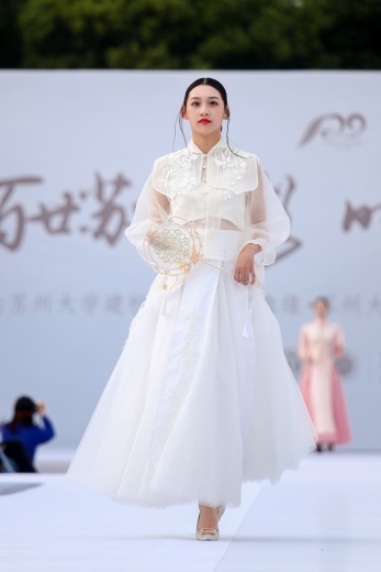 动态展伴随着民乐演奏《茉莉花》拉开帷幕,以服装秀为载体呈现了苏州大学120年的光辉岁月和纺织学科的蓬勃发展。60套作品,均以师生科研创新成果为主体,以自主研发的面料设计制作,完美融合了先进材料、绿色染整、数字图案、服装设计等“苏州大学”独家技术的元素。本次系列设计以时间为灵感,线迹起始于苏州大学建校,从民国旗袍的丝光彩韵到旧式经典的斑斓印花,穿梭变幻成透明光纤。大胆廓形,畅想未来。
