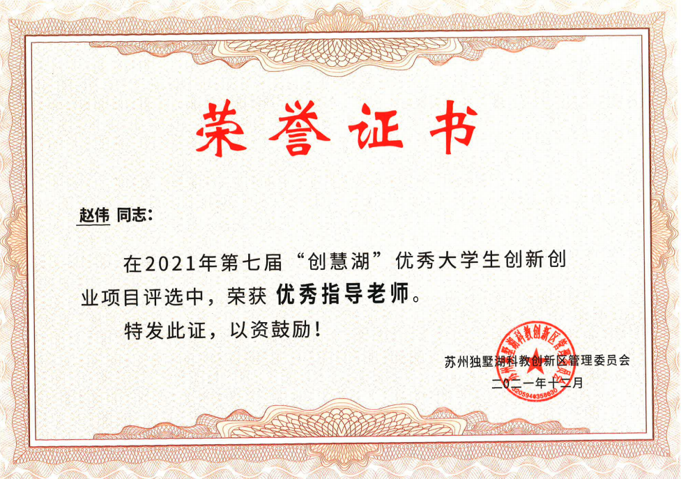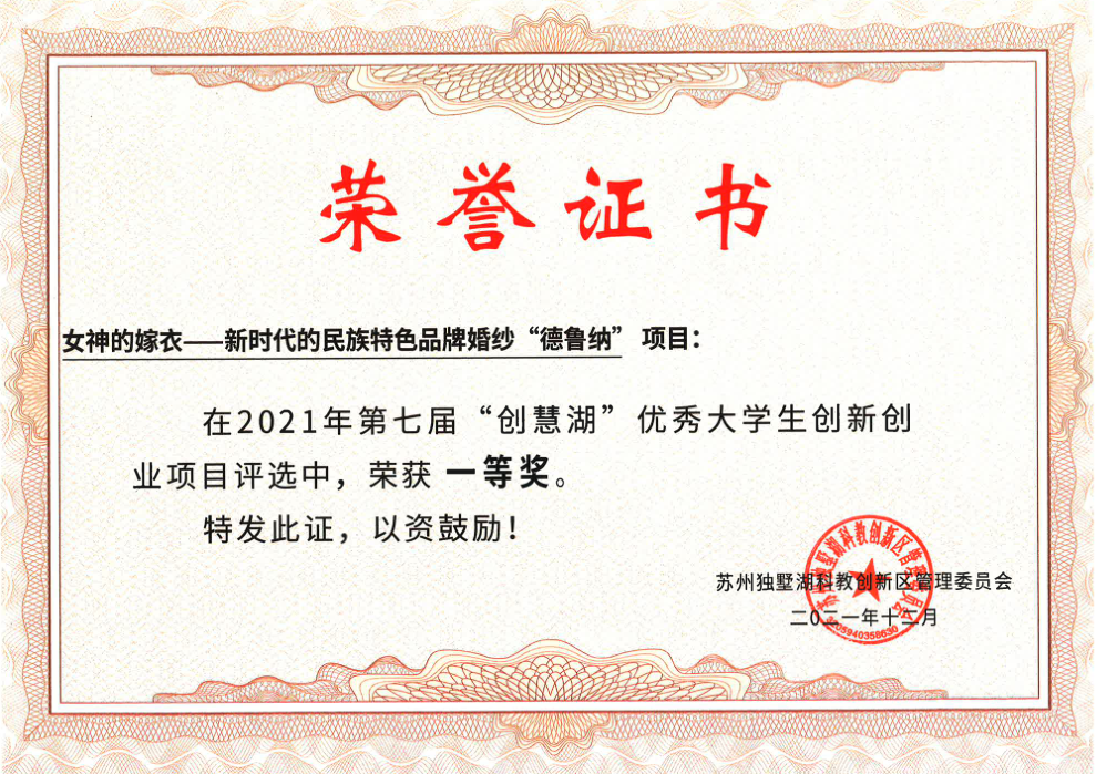 在第七届“创慧湖”优秀大学生创新创业项目评选中,苏州大学纺织与服装工程学院(紫卿书院)创新创业项目:《女神的嫁衣——新时代的民族特色品牌婚纱“德鲁纳”》荣获一等奖,《膜纺未来——中空纤维膜技术革新者》荣获二等奖,学院赵伟老师荣获创新创业优秀指导教师。