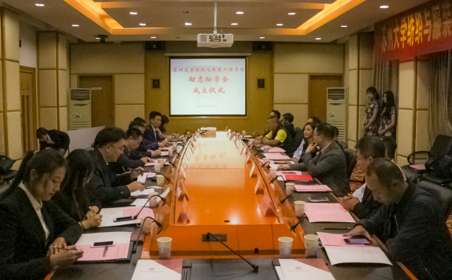 2017年10月27日下午,苏州大学纺织与服装工程学院“励志助学金”成立仪式在我校红楼会议中心201会议室举行。出席本次成立仪式的领导和嘉宾有香港捷迅集团董事长许旭升,香港百骏集团董事、中国社工协会公益委员会常务理事马晓明,同德投资合伙人温植成,安徽中兴继远信息技术股份有限公司董事长徐强,丰电科技集团股份有限公司董事长白俊钢,腾讯公司高级顾问陈发奋,亚港盈通科技发展有限公司董事长邓会波,南京斯坦德云科技股份有限公司董事长胡永生,青岛博海地产集团董事长贾建宇,鄂尔多斯市众和房地产开发有限责任公司总经理李健,广州市玛茜特皮具有限公司总经理殷霆;我校党委常委、纪委书记芮国强,苏州大学学生工作部(处)处长孙庆民,纺织与服装工程学院院长潘志娟,纺织与服装工程学院党委副书记、副院长潘爱华。纺织与服装工程学院党委书记董召勤主持此次成立仪式。