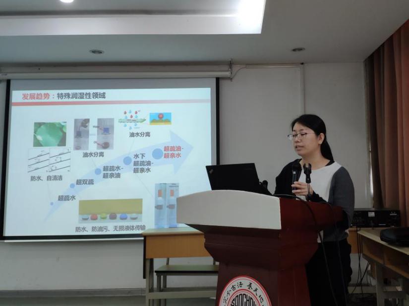 赵燕教授以“特殊润湿性织物材料”为题作汇报。报告中赵教授分析了特殊润湿性领域的发展趋势,以疏油-亲水面料和超疏液-光催化面料为重点,介绍了自己的研究工作。