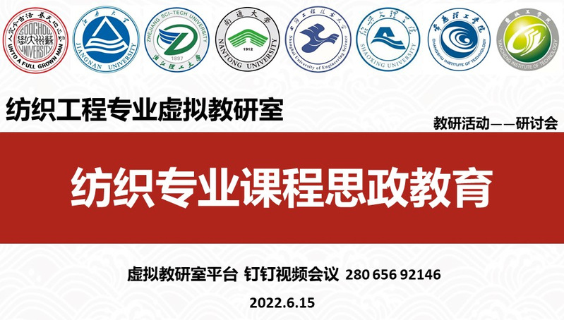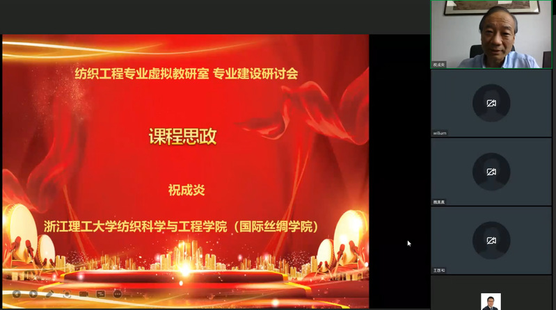 2022年6月15日,“纺织工程专业虚拟教研室”专业建设课程思政主题研讨会在虚拟教研室工作平台举行。研讨会以纺织专业课程思政教育为主题,邀请浙江理工大学祝成炎教授作主题发言,来自苏州大学、江南大学、浙江理工大学、南通大学、上海工程技术大学、绍兴文理学院、常熟理工学院、盐城工学院等8所高校的60多位教师参加了交流。会议由苏州大学纺织与服装工程学院副院长陈廷教授主持。