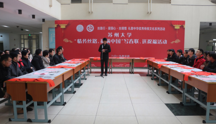 1月15日上午,“丝路行•爱国心•丝绸情”礼敬中华优秀传统文化系列活动之“情传丝路,福满中国”写春联、送祝福活动在北校区工科楼一楼顺利举行。原苏州大学副校长、全国茧丝绸行业终身成就奖获得者白伦教授,校宣传部副部长、新闻中心副主任程晓军,校学生工作部(处)副部(处)长段永锋,校团委副书记于潜驰,纺织与服装工程学院党委董召勤书记,院党委副书记卢永嘉,院工会主席周正华,院总实验室主任李刚,退休教师代表施建平教授,在职专业教师代表戴宏钦副教授,学院辅导员代表以及本科生、研究生、留学生代表共同参与了此次活动。活动由纺织与服装工程学院团委书记刘海主持。