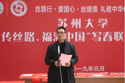 程晓军在致辞中讲到,“丝路行•爱国心•丝绸情”系列活动将校园文化生活与国家“一带一路”的倡议联系起来,非常有意义。丝绸文化是我国优秀传统文化的重要组成部分。“情传丝路,福满中国”活动将丝绸情怀融入春联,将丝绸文化与书法、传统节日结合,是对优秀传统文化的传承,也是创新。