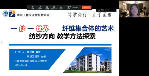 2022年6月29日,“纺织工程专业虚拟教研室”示范课在虚拟教研室工作平台如期举行。本次示范课由江南大学纺织科学与工程学院傅佳佳教授带来《纺纱学》的课程示范。来自苏州大学、江南大学、浙江理工大学、南通大学、上海工程技术大学、绍兴文理学院、常熟理工学院、盐城工学院等8所高校的30余位从事相关课程教学的老师参加了会议。会议由苏州大学纺织与服装工程学院副院长陈廷教授主持。