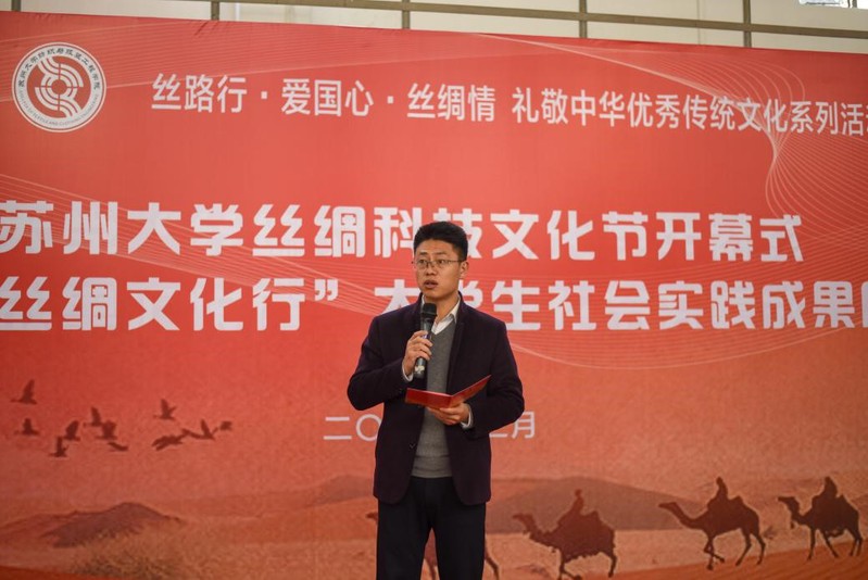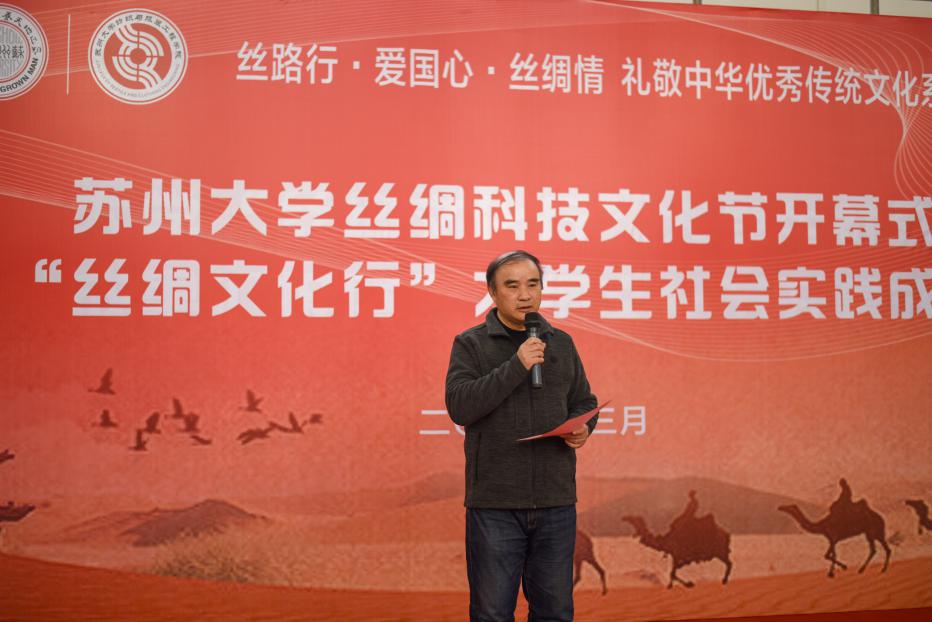 作为苏州大学礼敬中华优秀传统文化系列活动的重要环节之一,丝绸科技文化节是纺织与服装工程学院依托自身深厚的丝绸历史文化优势,集文化传承、科技创新于一体的丝绸科技文化盛会。学院团委书记刘海首先介绍了本次丝绸科技文化节的各项精彩活动,并汇报了作为苏州大学礼敬中华优秀传统文化系列活动的重要起点,今年寒假开展的“丝绸文化行”大学生社会实践活动取得的丰硕成果。