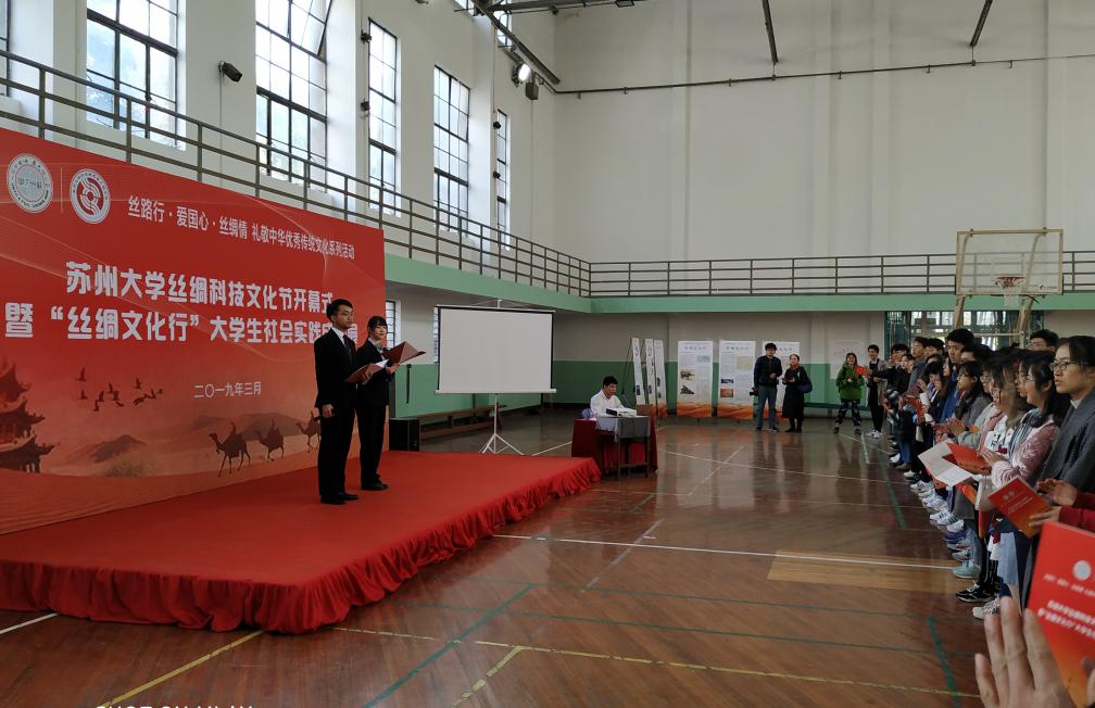 为引导广大师生树立文化自信,自觉弘扬中华优秀传统文化,2019年3月16日上午,苏州大学丝绸科技文化节开幕式暨“丝绸文化行“大学生社会实践成果展在北校区体育馆隆重举行。苏州大学关心下一代工作委员会副主任吴俊生,校党委常委、党委宣传部部长、新闻中心主任陈晓强,学生工作部(处)副(处)部长潘爱华,团委副书记刘春雷,纺织与服装工程学院党委书记董召勤,学院党委副书记、副院长卢永嘉,学院专业教师代表以及辅导员老师们出席本次开幕式。“丝绸文化行”社会实践活动各分团负责人以及纺织与服装工程学院各年级学生代表共同参加了本次开幕式。