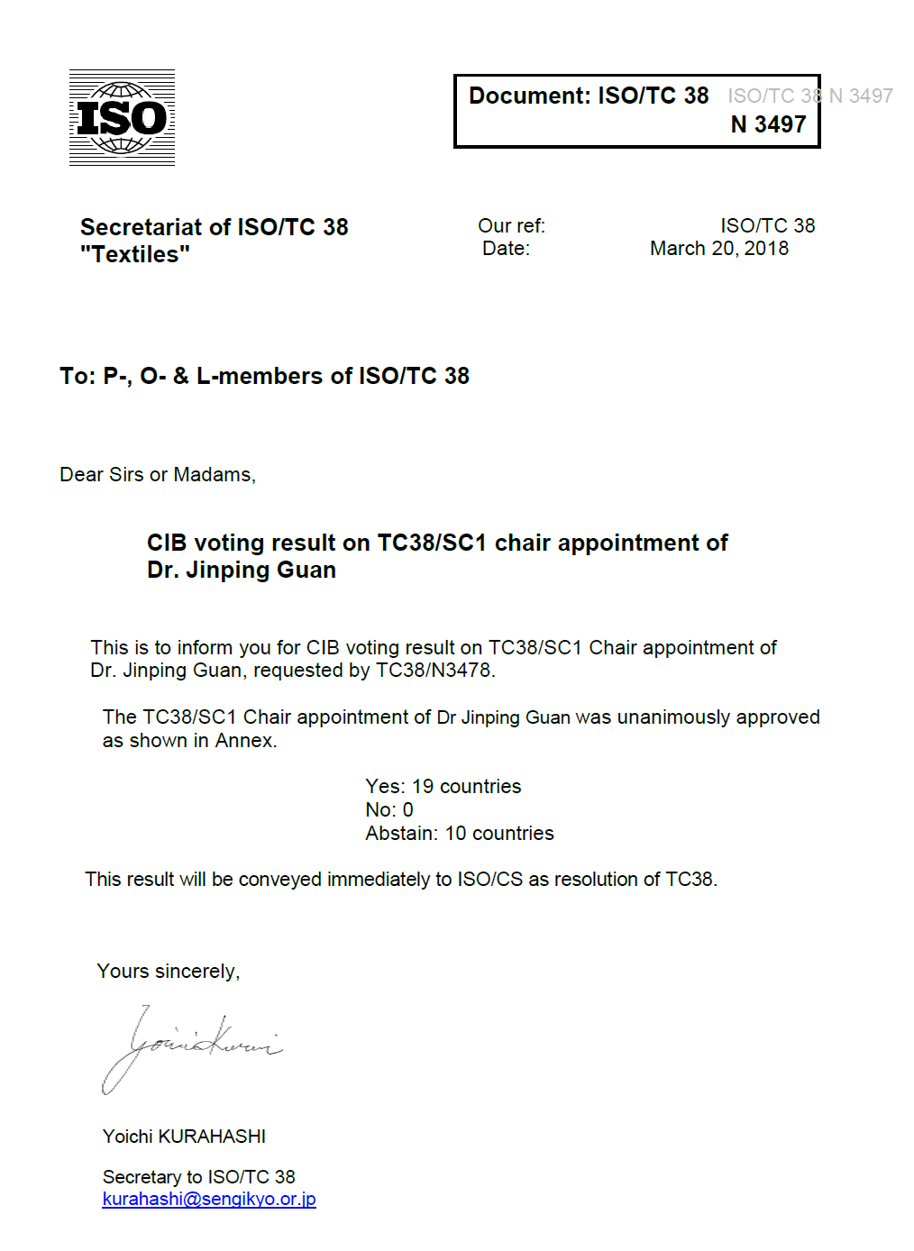 日前,纺织与服装工程学院关晋平博士接到国际标准化组织(ISO)中央秘书处任命文件,正式担任ISO国际标准化组织纺织品技术委员会/有色纺织品及染料试验分技术委员会(ISO/TC38/SC1)主席。ISO/TC38/SC1主席是经中国技术对口单位纺织工业标准化研究所推荐,通过国家标准化管理委员会面试,再由中、美、英、法、德、意、日、韩、印度等成员国投票产生,任期3年。