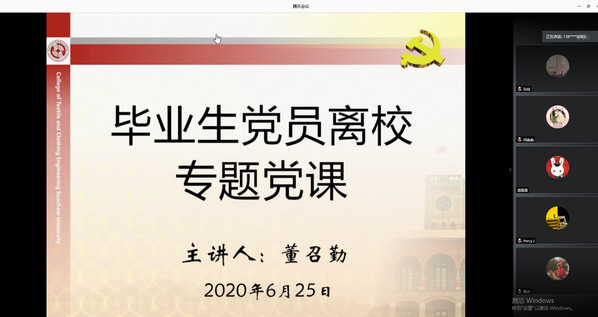6月25日中午,纺织与服装工程学院党委通过“腾讯会议”召开了线上毕业生党员离校专题党课。学院党委书记董召勤,党委副书记严明、组织人事秘书周国丽老师、团委副书记蒋闰蕾老师、学工办副主任赵伟、辅导员孙晓旭老师及学院全体毕业生党员参加了会议,会议由蒋闰蕾主持。