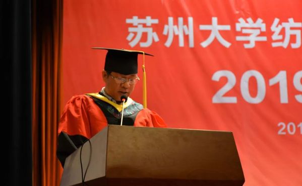 教师代表、2019年苏州大学 “我最喜爱的老师”、2015级非织造材料与工程班班主任朱新生表达了对毕业生的鼓励和期望。“你们即将奔向社会,走上工作岗位,施展自己的才华,由衷为你们高兴,为你们自豪!”建议每一位同学在前进道路上,摆正自己的位置,从小事做起,真诚地向实践请教,不忘学习,学会做人,不忘良知。无论你们走得多远、无论你们飞的多高,母校永远是你们坚强的后盾。