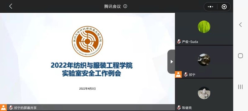 为尽快落实《苏州大学2022年实验室安全检查和专项整治实施方案》的通知,巩固我院疫情期间实验室安全维护与建设成果,进一步推动学院安全管理水平向更高层次发展。4月3日上午,我院召开了本年度实验室安全工作重点工作线上交流例会。学院严俊副院长,现代丝绸刘欣亮副主任,总实验室祁宁副主任、李春萍副主任,学院专职安全员银华,兼职安全员魏兴,院团委书记研究生辅导员蒋闰蕾,陈健亮、解宇两位老师,以及校聘学生安全员宋贝贝和宋鹏宇参与了会议。